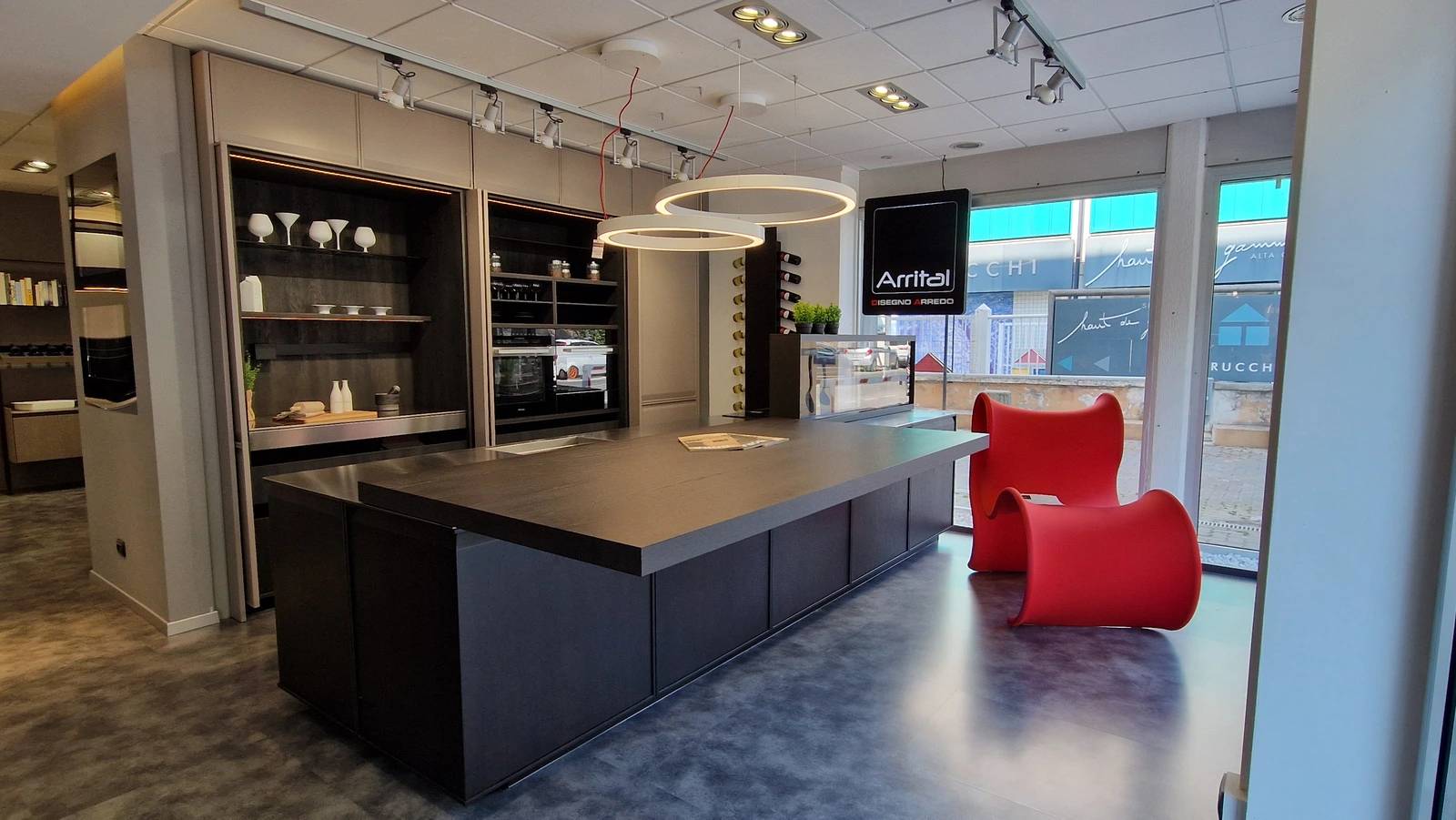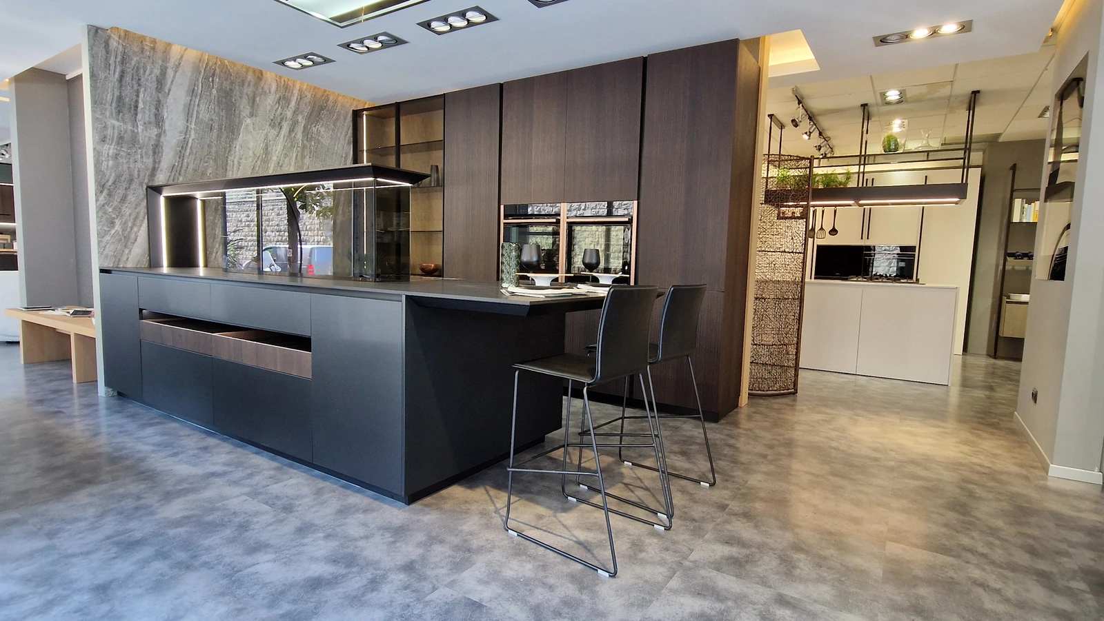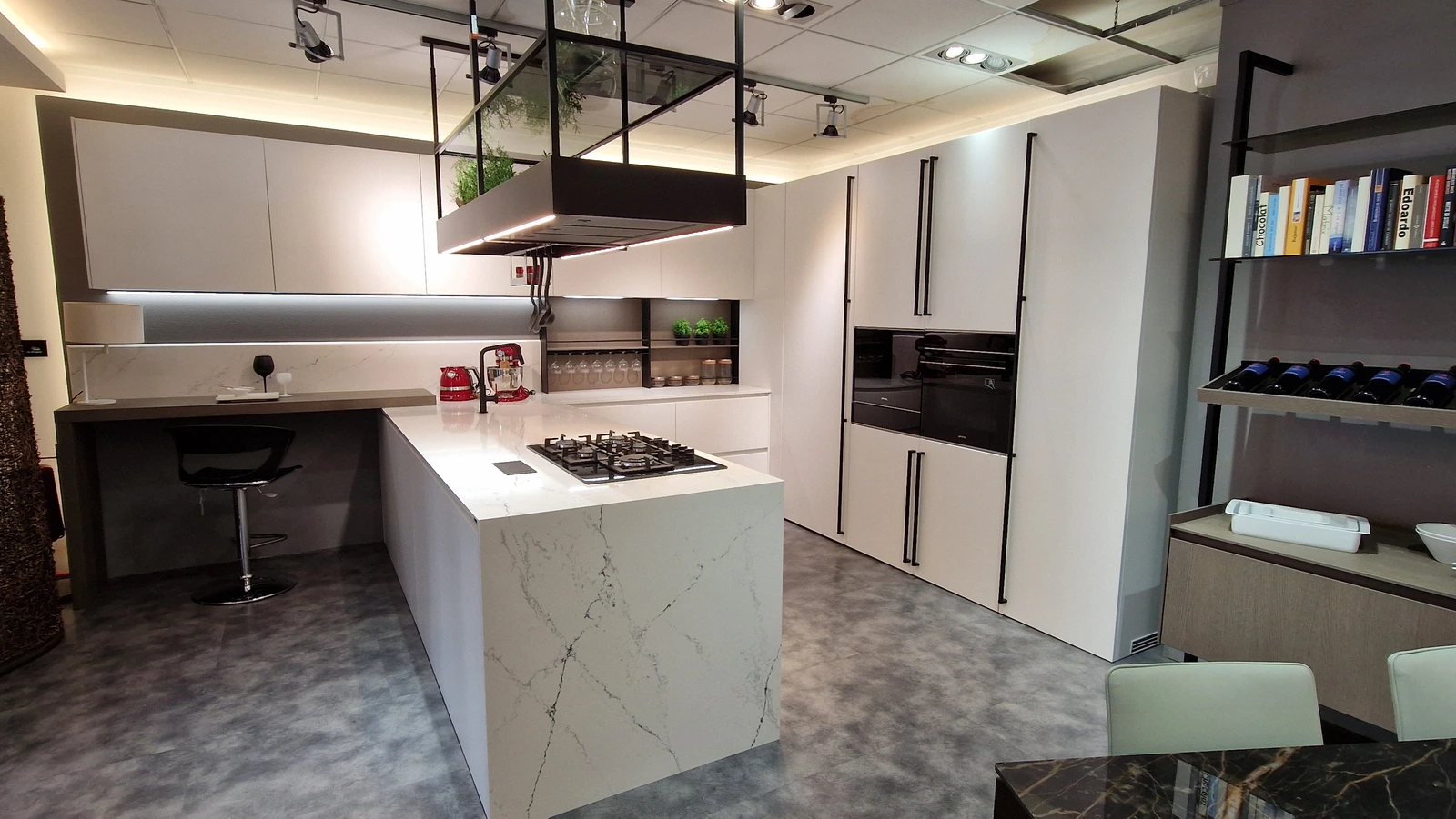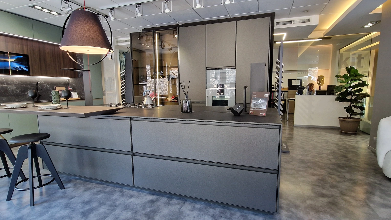 Gran parte dello spazio espositivo è dedicato alle cucine. Sono esposte composizioni importanti e sempre attuali, che permettono di toccare con mano la qualità dei prodotti esposti e di valutarne funzionalità e possibilità progettuali.